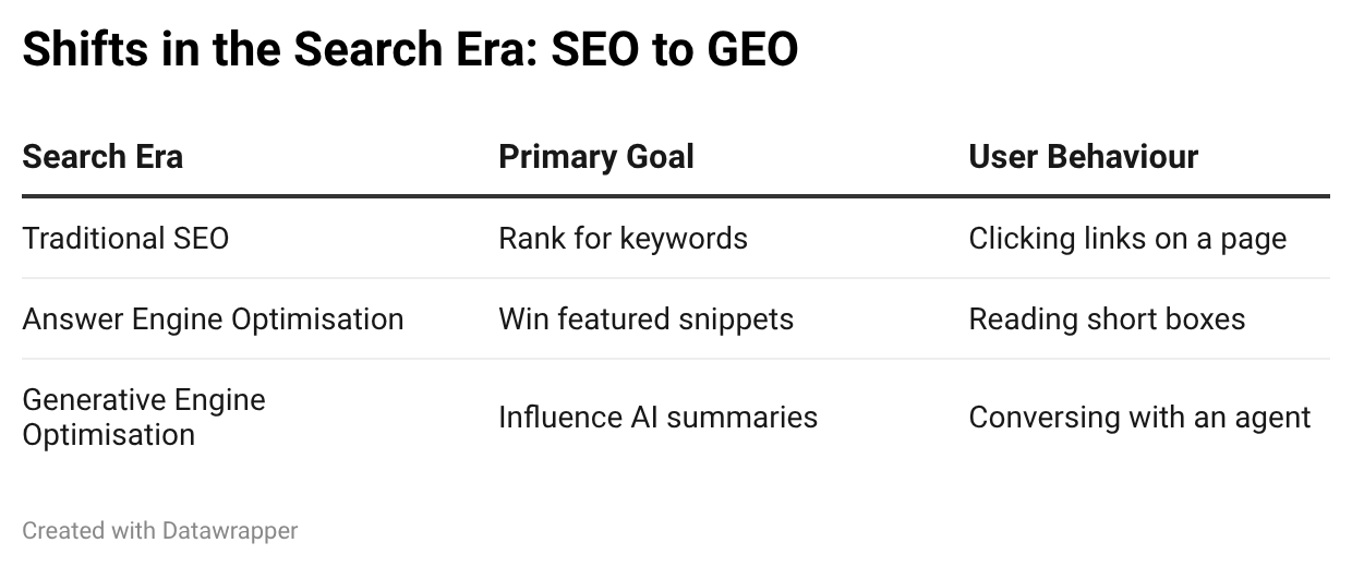Recently, many of the companies I consult with are telling me a similar story. They see an increase in traffic coming from AI sources. Or, they have heard the term GEO in a boardroom and feel a sense of dread. My clients want to understand how they can capitalise on this shift. They want to know if the rules of growth have changed again.
